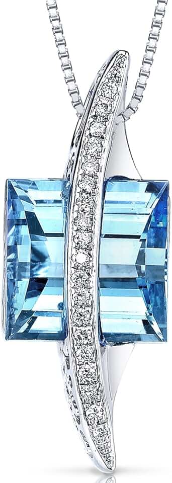 PEORA 7 Carats Swiss Blue Topaz and Diamond Designer Pendant 14K White Gold, Genuine Gemstone, Square Emerald Cut 10mm, with 18 inch Chain