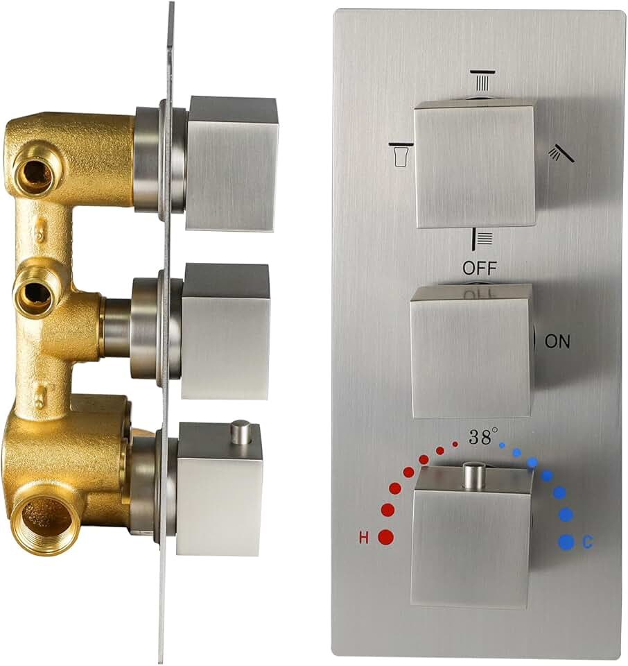 Solid Brass 4 Outlets Shower Diverter Valve, HOMEDEC Thermostatic 4 Ways 3 Handles Control Shower Mixing Valve Trim Kit Rough In Valve Replacement, Brushed Nickel
