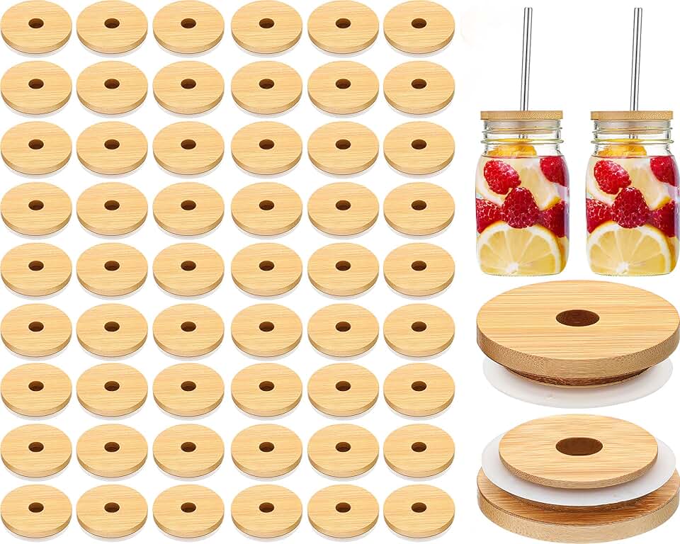 300 Pieces 70mm Bamboo Jar Lids Bulk with Straw Hole for Glass Cups Reusable Wooden Mason Jar Lids for Beer Can Cups, 2.76 Inch Lids with Silicone Ring for Regular Mouth Drinking Jars