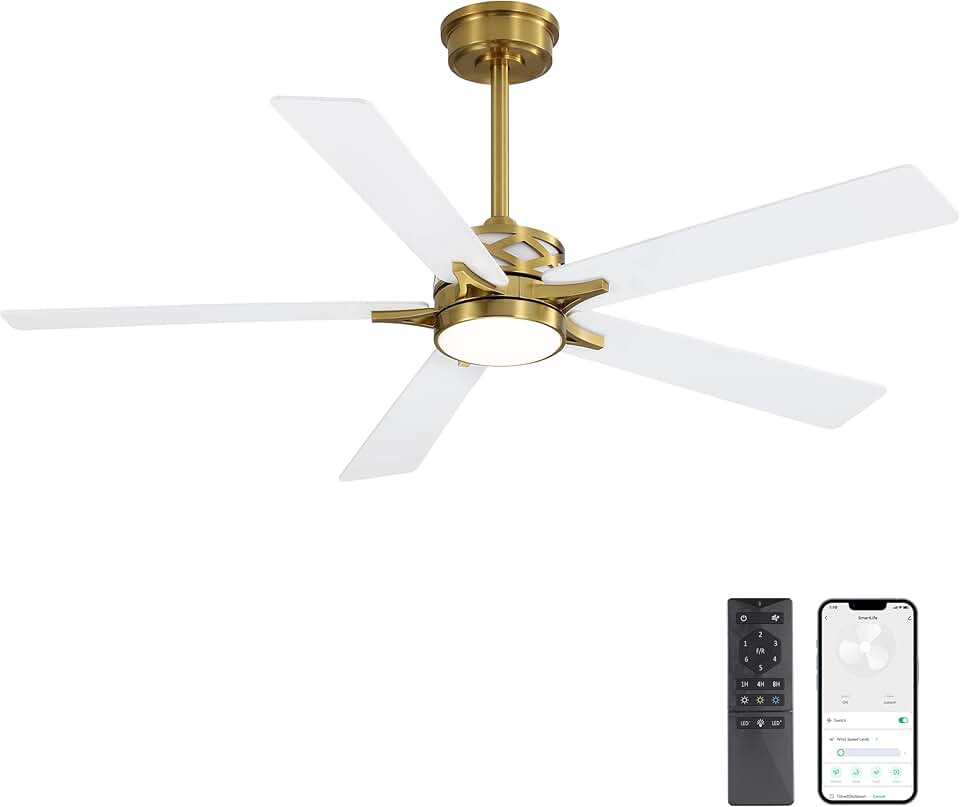60" Smart Ceiling Fan with Lights and 3 Downrods, 5 Plywood Blades, 6 Speeds Reversible DC Motor, Works with Alexa and Google Assistant, 3CCT Dimmable LED Large Ceiling Fans, Brass and White