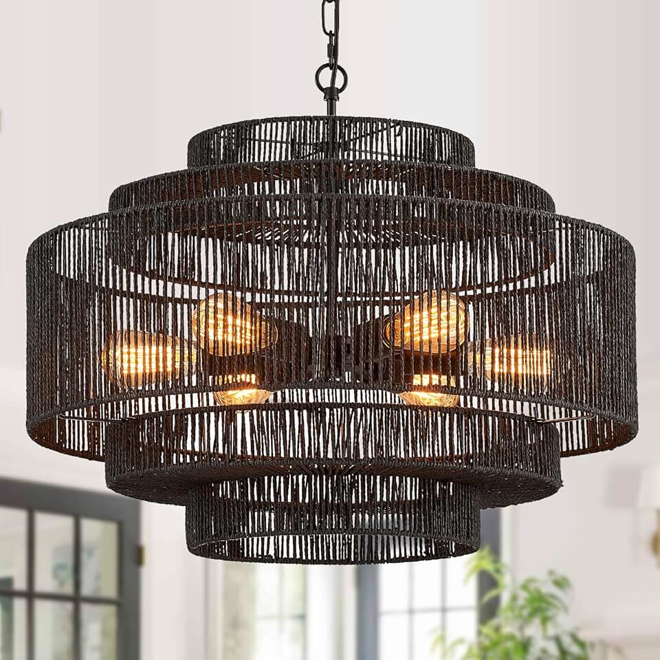 Large Chandelier 25.6in Hand-Woven Rattan Chandeliers Boho 6-Light Chandelier Vintage Black Farmhouse Chandeliers Wicker Coastal Bamboo Chandelier for Living Room Bedroom Dining Room