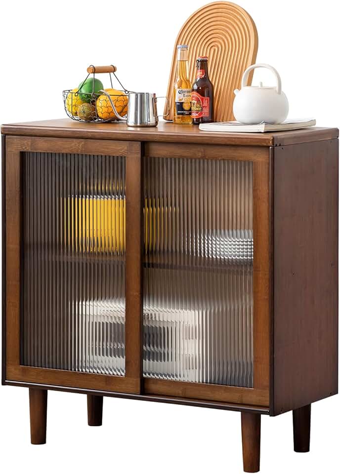 Bamboo Sideboard Buffet Cabinet, Rattan Kitchen Storage Cabinet, Boho Coffee Bar Tables for Kitchen Living Room Hallway Office, Walnut