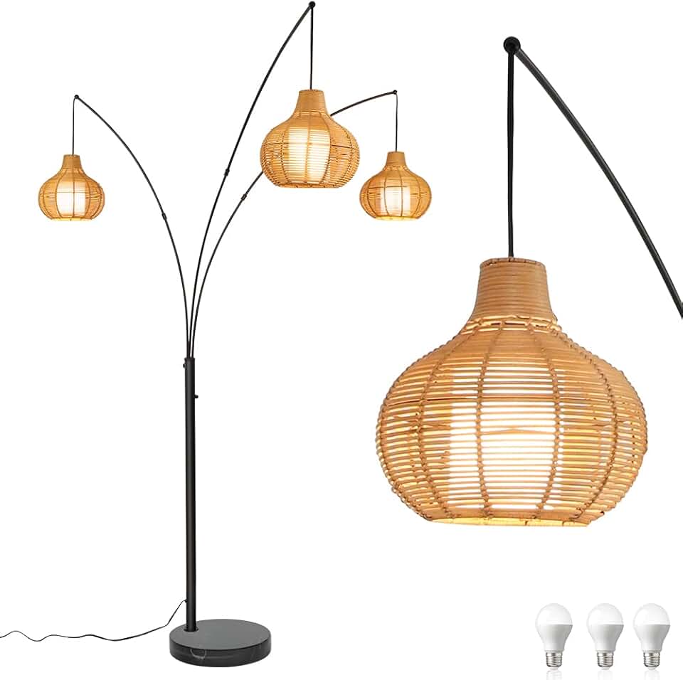 3-Light LED Arc Floor Lamps, Adjustable Modern Tall Standing Reading Lamp with Bamboo Lampshades & Marble Base, Rattan Floor Lamp for Living Room Bedroom Office Study, E26 Bulbs Included