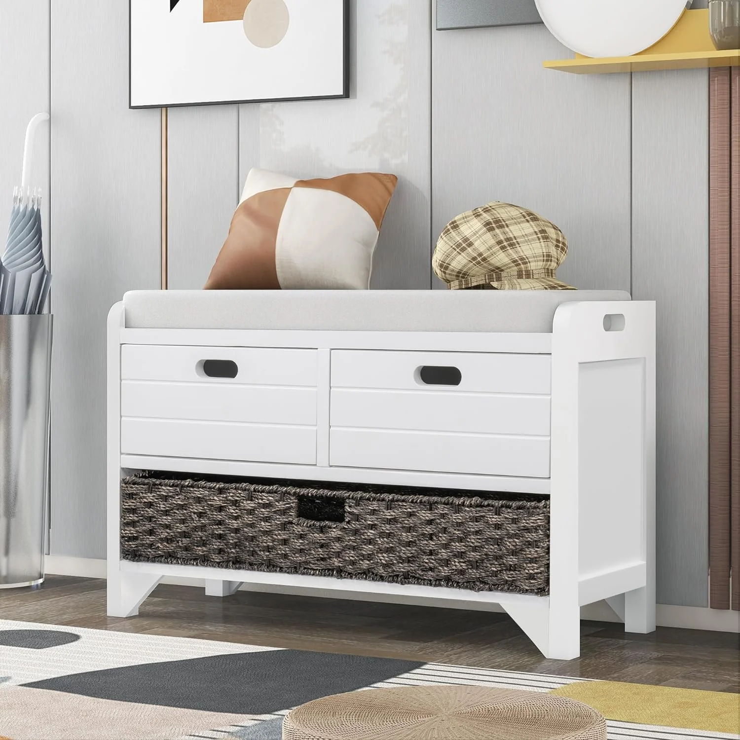 Wood Storage Bench with Drawers and Basket, Shoe Bench with Seating and Cushion for Hallway Entryway Living Room, Full Assembled (White Wash-2 Drawers)