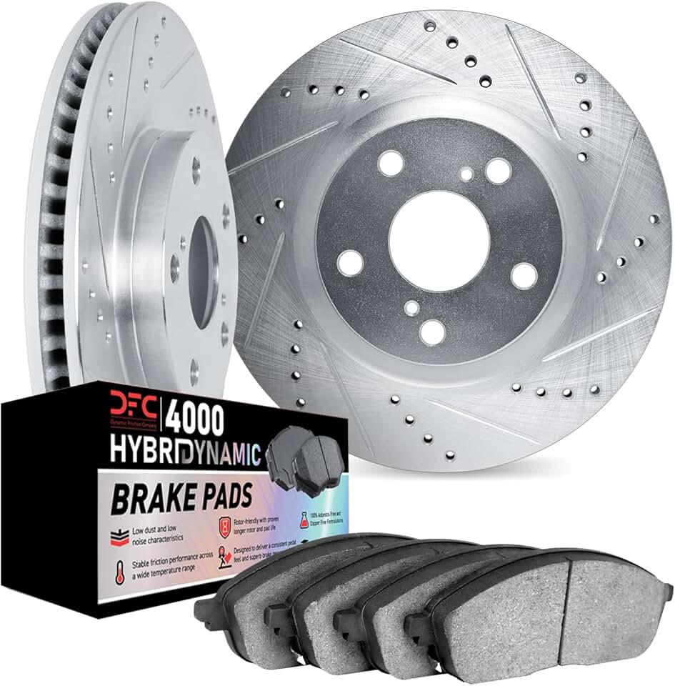 Dynamic Friction Company Front Brake Rotors Kit Drilled Slotted Silver | 4000 HybriDynamic Brake Pads | Fits 1992-1993 Mercedes-Benz 500E