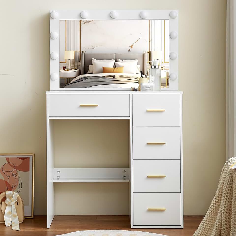 Vanity Desk with Large Led Mirror and Power Strip, 31.5" W Makeup Vanity Table Set with Storage Drawer & Shelves, 3 Lighting Color Brightness Adjustable