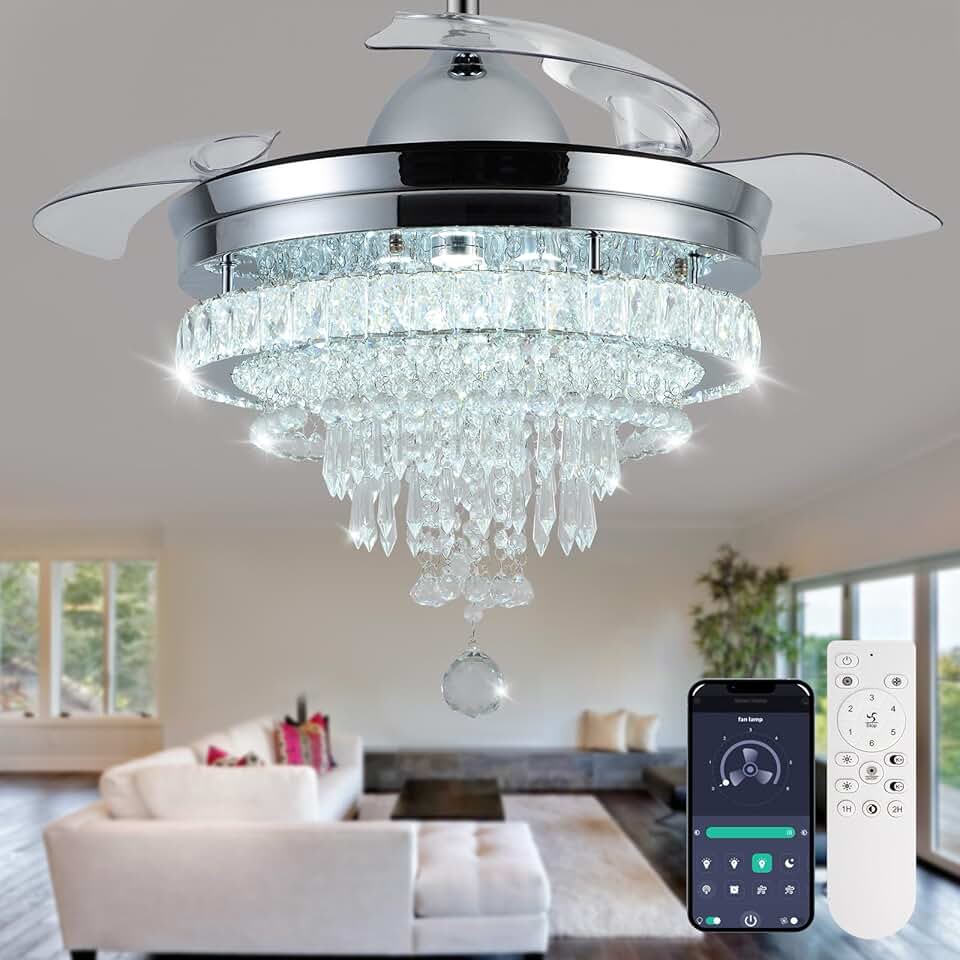 LEONTYNE 42" Chandelier Fandeliers Dimmable Ceiling Fans LED Crystal Ceiling Fan with Light and Remote 3 Color 6 Speed 4 Blades Retractable Fans for Living Room Dining Room Bedroom (Memory & Timing)