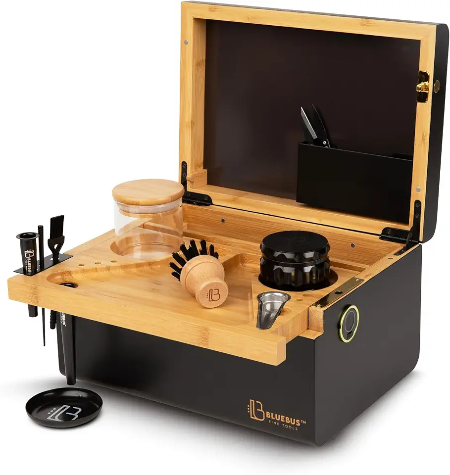 Discovery 2.0 Large Bamboo Box with Fingerprint Lock, Lid, Glass Jars and Tray - Decorative Wooden Storage Box for Keepsakes (10.8" L x 7.87" W x 6" H) (Black)