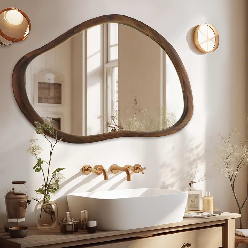 Irregular Wall Mirror, 35" x 24" Wood Frame Asymmetrical Mirror, Modern Decorative Mirror for Living Room Bathroom Bedroom Entryway, Wall Mounted Mirror, Walnut