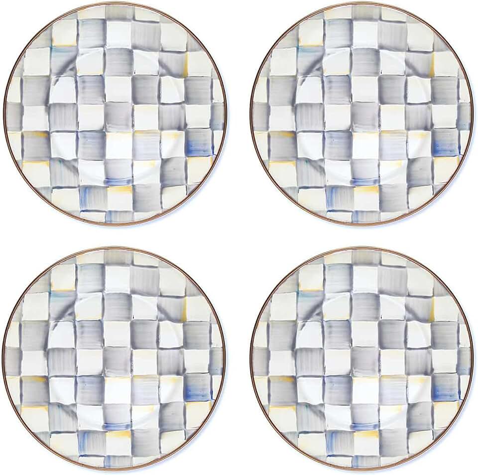 MACKENZIE-CHILDS Enamel Salad and Dessert Plate, Small Plate for a Dessert or Appetizer Dish, 8 Inches, Set of 4, Gray-and-White Sterling Check