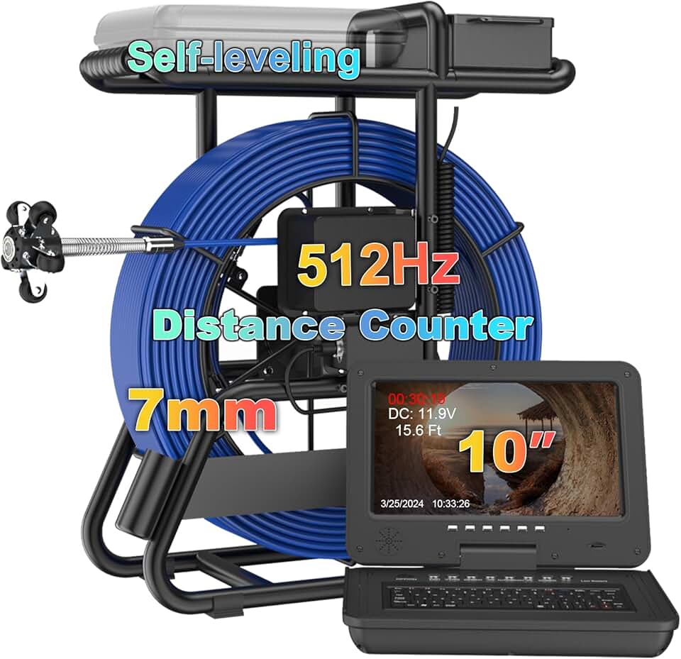Anysun Sewer Camera with 512Hz Transmitter, Distance Counter, Self-Leveling Pipe Camera 165ft/50m 0.28in/7mm Cable, 10'' IPS 1080P Screen Sewer Inspection Camera with DVR/Audio Recording-16GB
