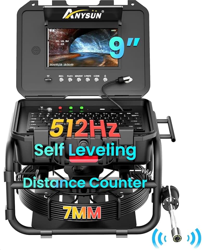 Anysun Self-Leveling Sewer Camera with 512Hz Transmitter, Distance Counter, 1080P HD 9" IPS Screen, 7mm 131ft Cable Pipe Inspection Camera System with 16GB DVR, Voice Recording, Keyboard