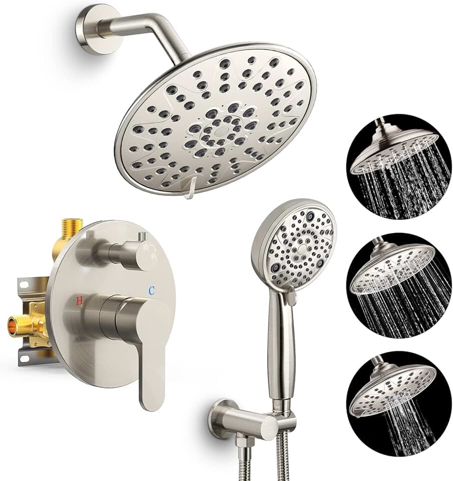 SR SUN RISE Shower Faucet - 3 Functions High Pressure 8 Inch Rain Shower Head System- 8 Settings Handheld Shower Head Fixtures- Valve Included - Brushed Nickel