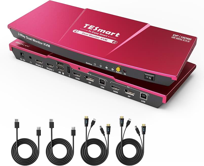 TESmart DisplayPort + HDMI KVM Switch 2 Monitors 2 Computers 4K@60Hz, Dual Monitor KVM Switch 2 Port Extended Display, EDID Emulators, USB 2.0, L/R Audio, Hotkey Switch, Button Switch with All Cables