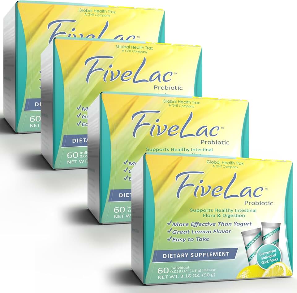 GHT - FiveLac Lemon Probiotic Powder Drink Mix, Probiotics for Women, Men, and Kids - Smooth Digestive Support and Elimination – Relieves Occasional Constipation and Gas - 60 Packets (4 Pack) Non-GMO
