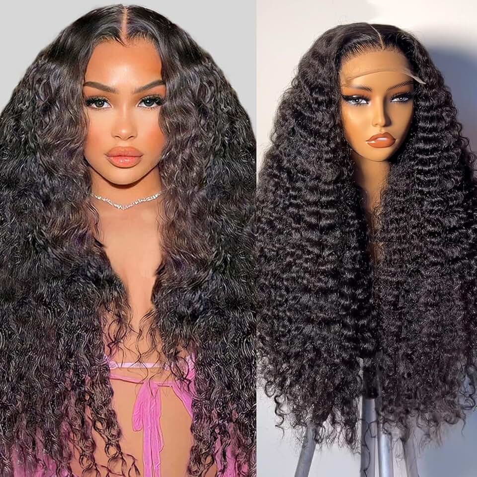 5x5 Lace Closure Wigs Human Hair Deep Wave Pre Plucked Curly HD Transparent Lace Front Wigs with Natural Hairline 200 Density Gluesless Human Hair Wigs for Women Natural Black Color 30 Inch