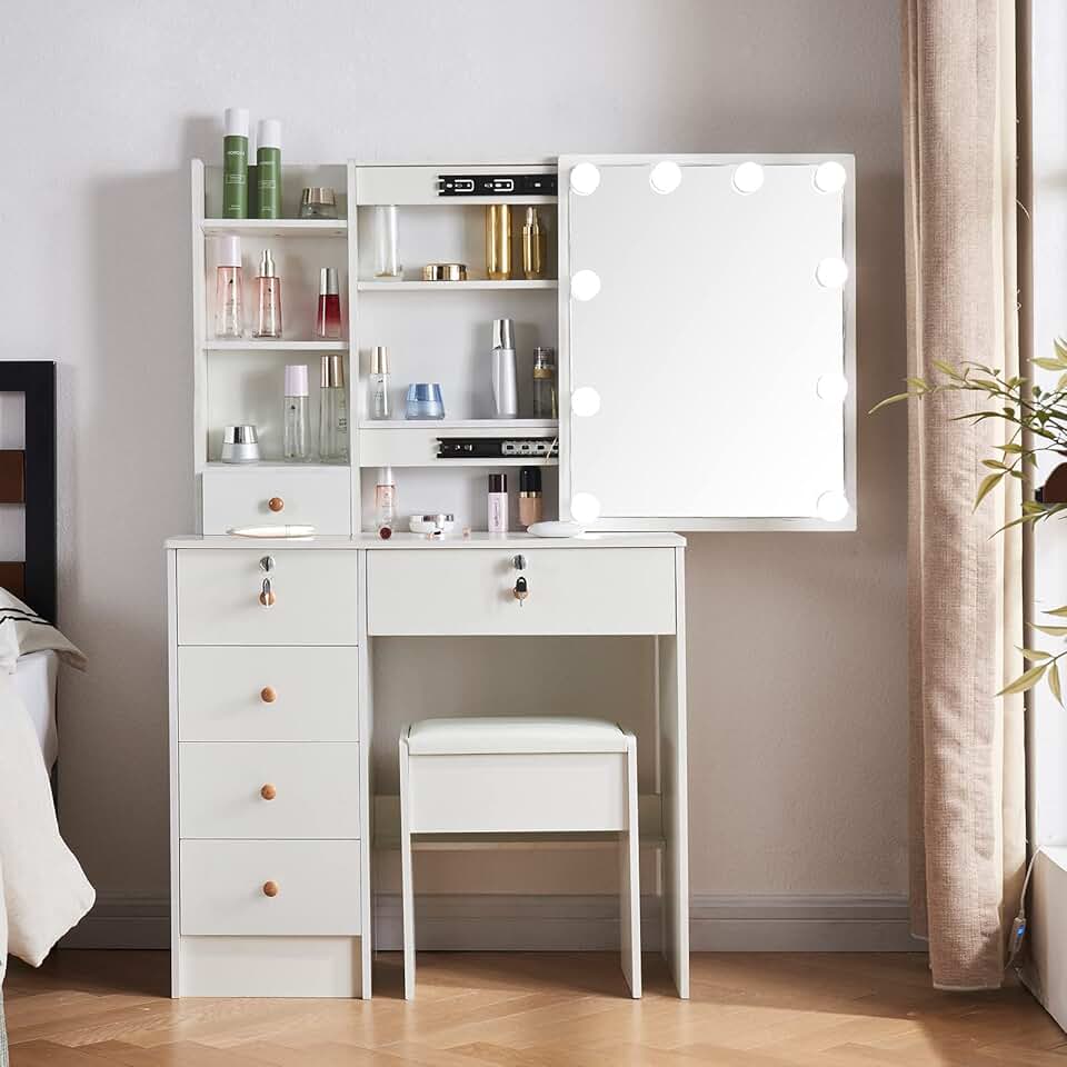 Vanity Table with Lights, Makeup Vanity Dressing Table with Sliding LED Lighted Mirror, Vanity Desk with 5 Drawers and Cushioned Stool Set, White Modern Dresser for Bedroom