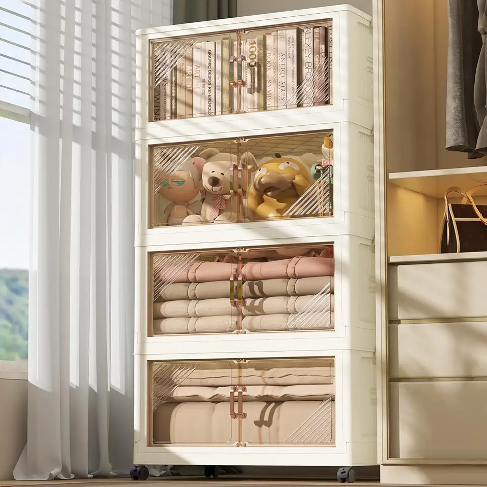 4 Storage Bins with 4 Lids, 23 Gal Collapsible Storage Bins, 4 Packs Stackable Storage Bins with Wheels,Large Closet Organizers and Storage, Double Door Stackable Storage Bins for Home, Ofiice, Dorm