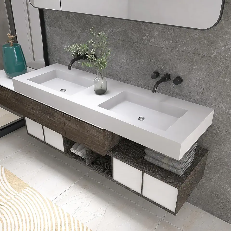 59"X19" Stone Resin Wall Mounted Floating Sink,Bathroom Vanity with Sink Solid Surface Bathroom Pedestal Sink Basin with No Faucet Hole and Pop-up Drain, Matte White