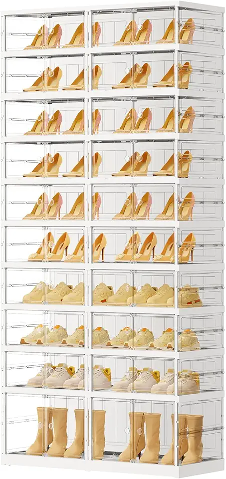 10 Tiers 20-40 Pairs Foldable Shoe Boxes Large Plastic Shoe Storage Rack Collapsible Shoe Organizer for Closet Clear Stackable Shoes Shelf Storage Cabinet with Doors Quick Assembly White