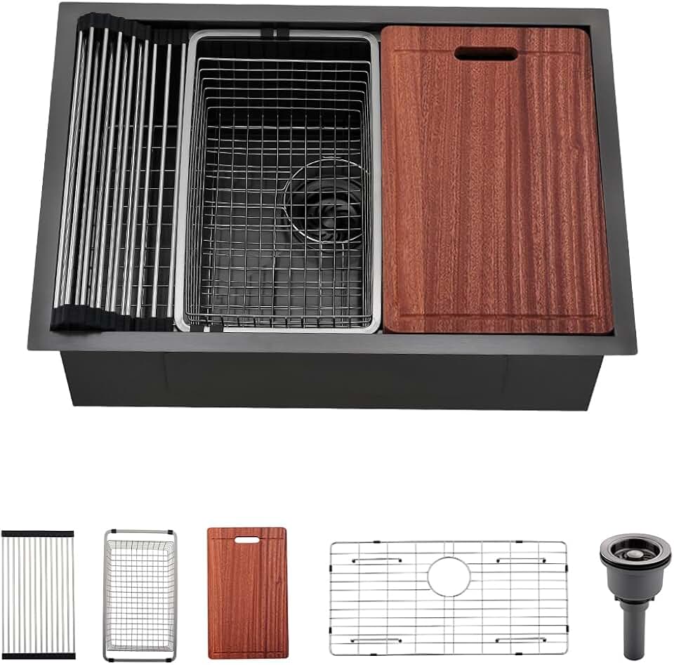 27 Black Undermount Workstation Kitchen Sink, Dorzom 27”x19” Metallic Matte Black Stainless Steel 18 Gauge 10 Inch Deep Undermount Workstation Single Bowl Kitchen Sink with Accessories
