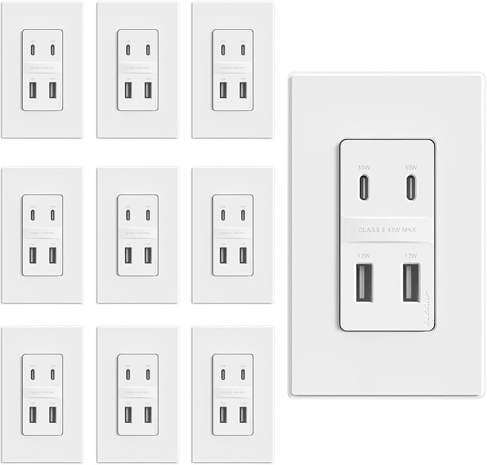 ELEGRP USB Wall Outlet, 42W Fast Charge & Power Delivery 4-Ports USB Charger, Wall Outlet with 4 USB Ports, UL/CUL Listed, Wall Plate Included, 10 Pack, Matte White