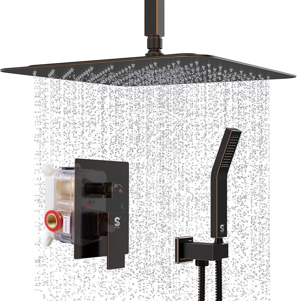 SR SUN RISE 16 Inches Oil Rubbed Bronze Shower Faucets Sets Complete Bathroom Rain Mixer Shower System Ceiling Mounted Rainfall Shower Head System (Contain Shower Faucet Rough-In Valve Body and Trim)