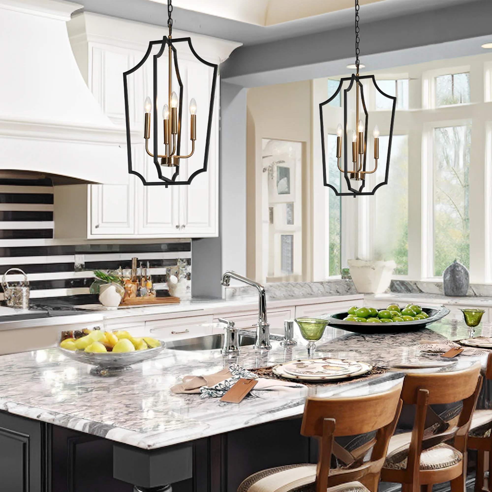 Modern Farmhouse 4-Light Black Gold Lantern Chandeliers Metal Pendant Light for Dining Room