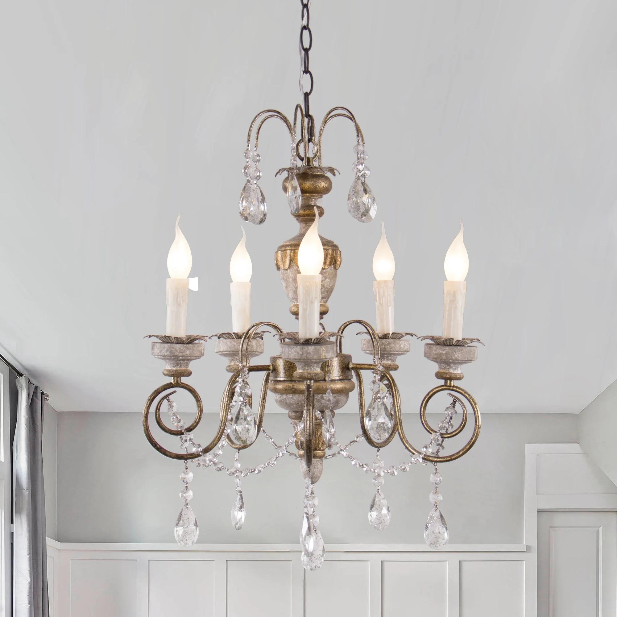 5-Light Rustic Distressed White French Country/Cottage Crystal Chandelier