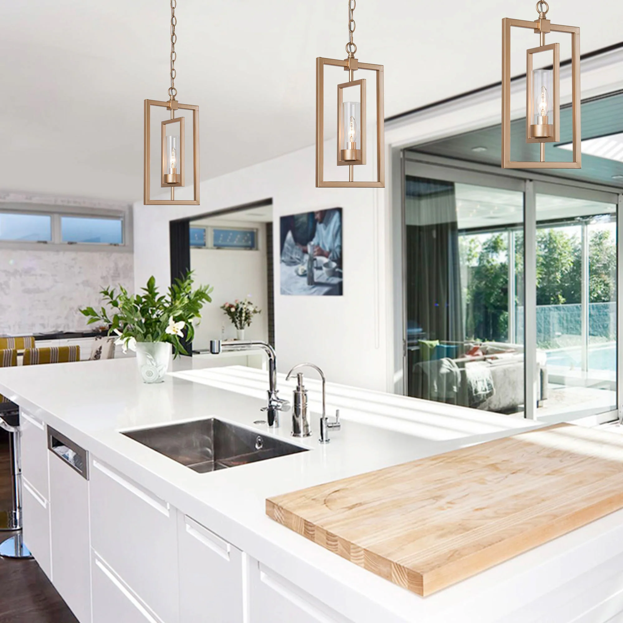 Mid-century Modern Gold Lantern Pendant Farmhouse Dimmable LED Rotatable Kitchen Island Light with Cylinder Glass