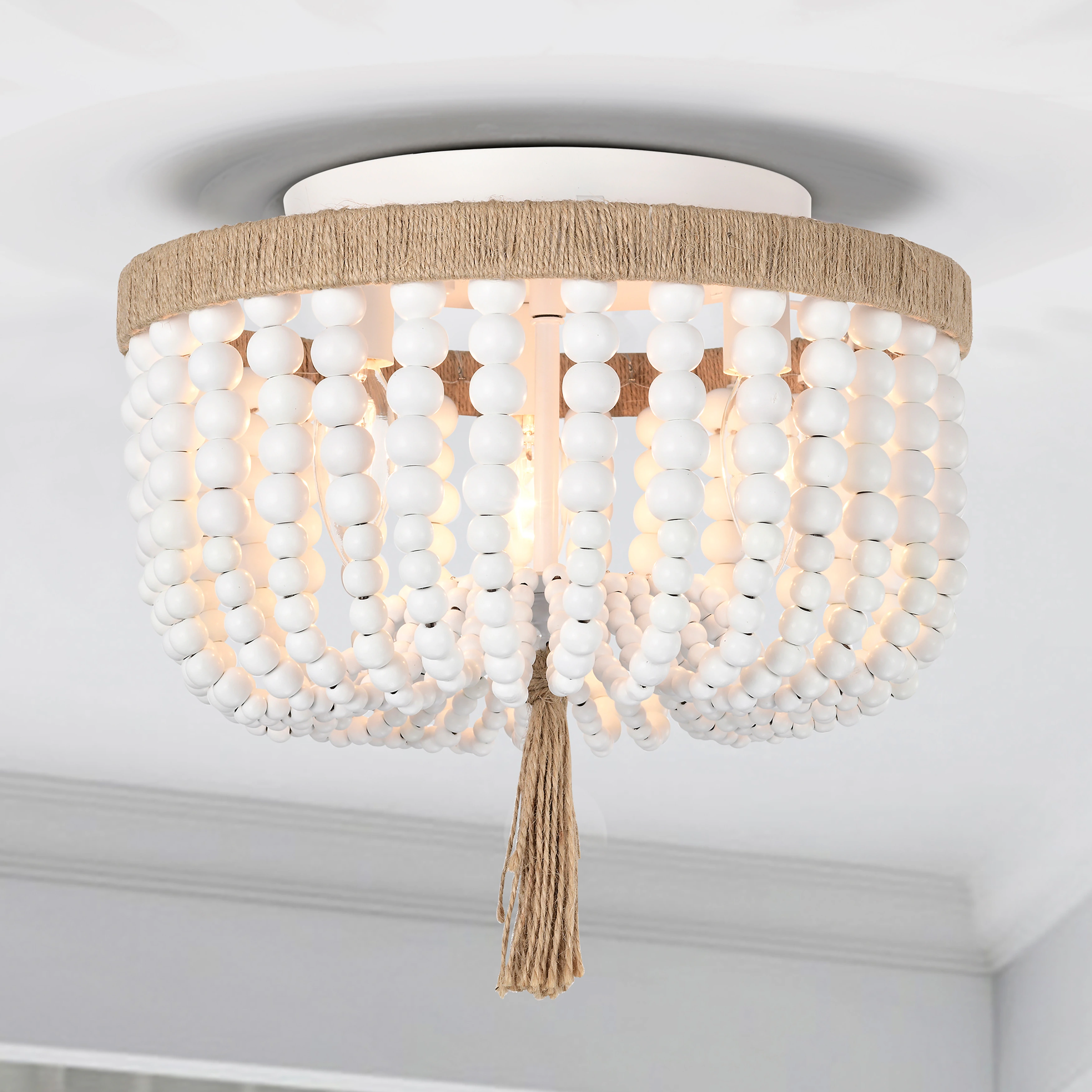White Wood Beaded Chandelier 3-Light Farmhouse Wood Bead Light