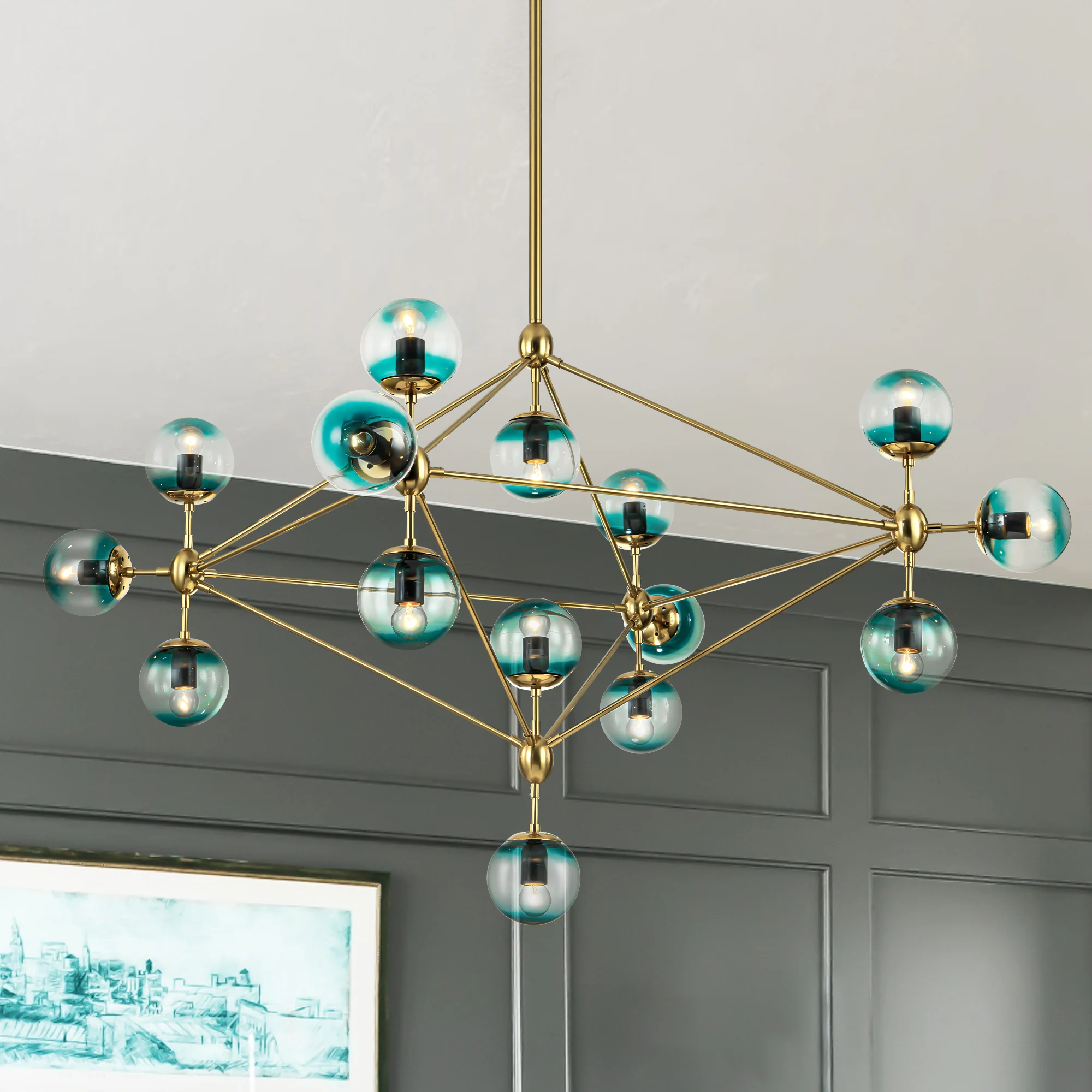 15-Light Modern Sputnik Cluster Geometric Chandelier with Gradient Blue Glass Globe Bubble