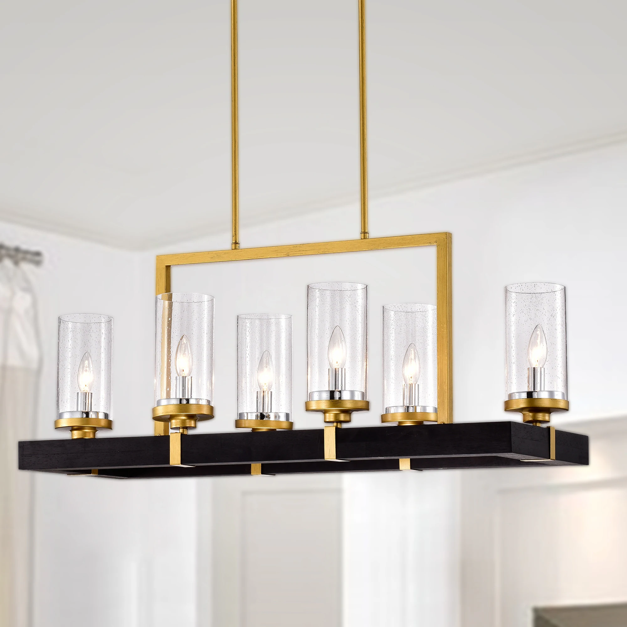 Wood and Metal 6-light Linear Chandelier with Seeded Glass Shades Gold / Black