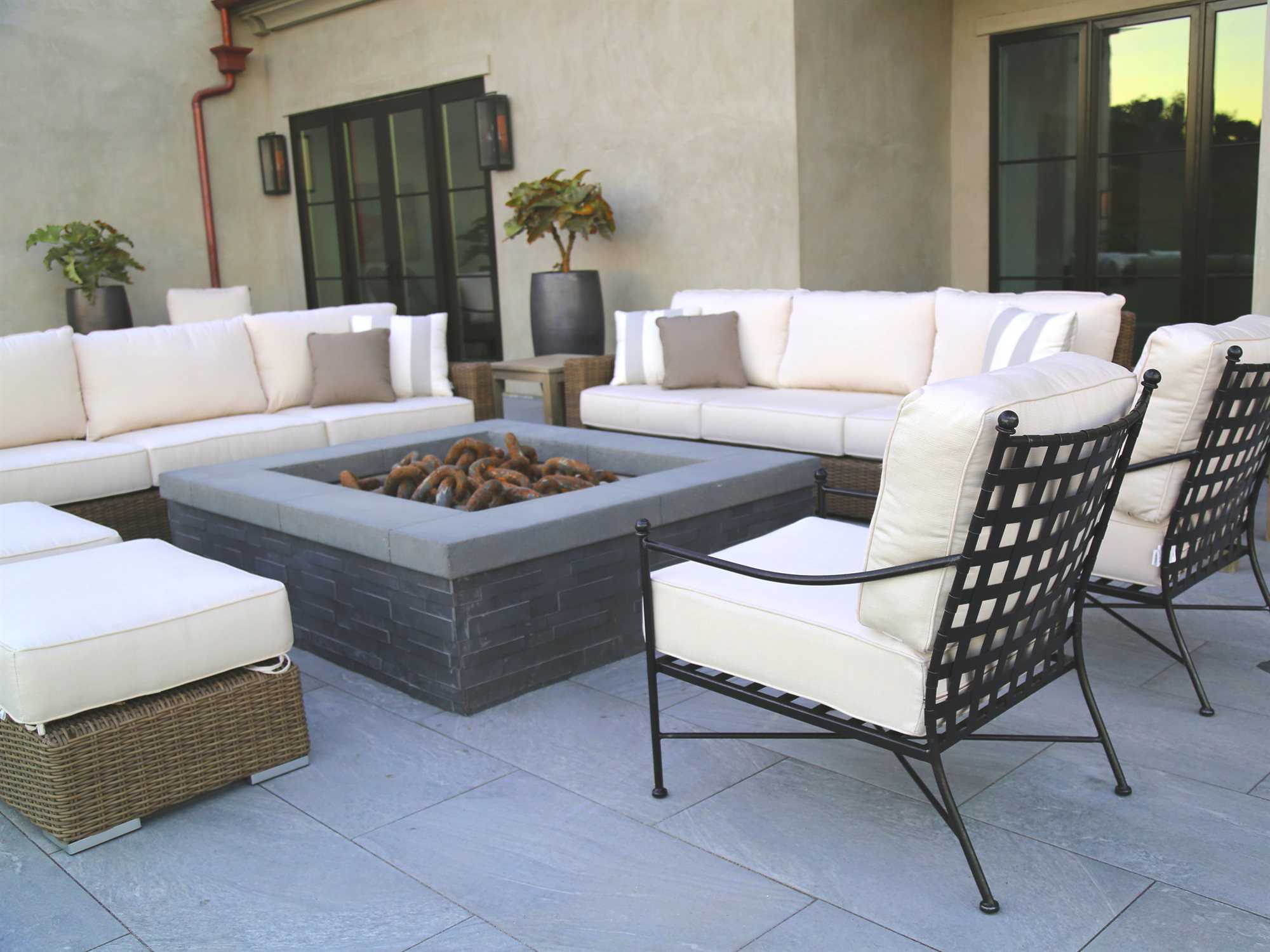 Coronado Wicker Driftwood Fire Pit Lounge Set in Canvas Flax with Self Welt